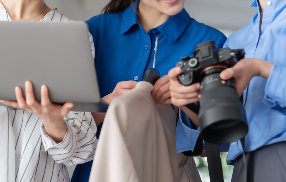 カメラ前の調整やモデルフィッティング、衣装管理、物撮りなど